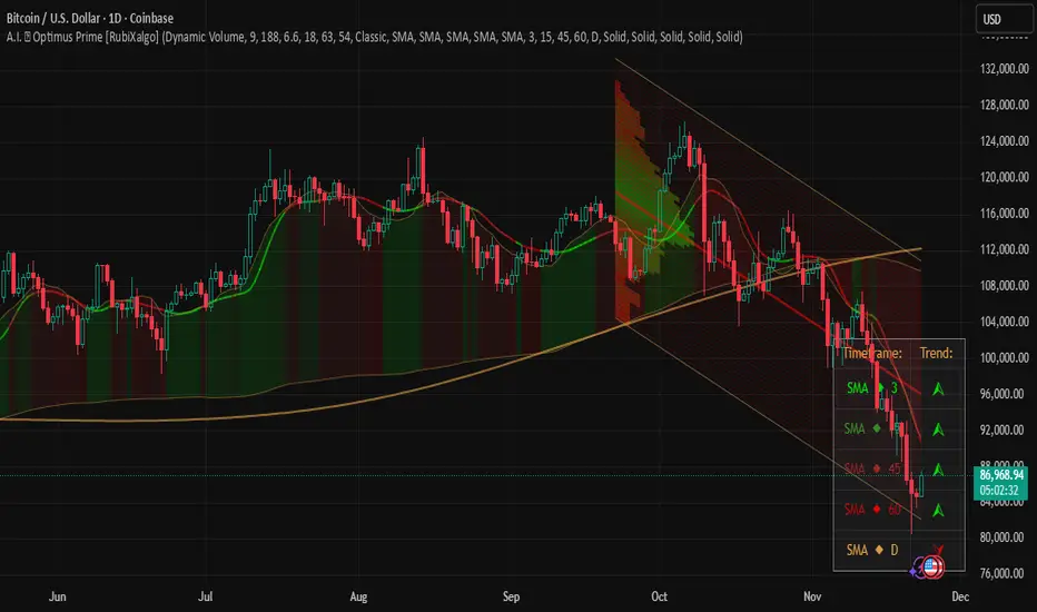 Just as a speed-cuber solves the cube blindly while juggling, Optimus Prime solves the market in real time using adaptive Kalman filters, k-NN machine learning, LOWESS smoothing, dynamic volume delta, and color-gradient intelligence — turning chaos into an intuitive traffic-light trading experience.Core FeaturesDual Kalman “Rubik” lines (Fast & Slow) with zero-lag adaptive scaling