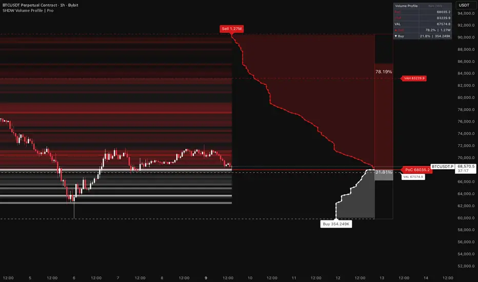 SHDW Volume Profile renders a real-time volume profile directly on your price chart, providing a granular view of where volume was transacted across discrete price levels. Unlike simple volume bars, this indicator distributes volume into configurable bins and highlights the most critical institutional reference levels: the Point of Control (PoC), Value Area High (VAH), and Value Area Low (VAL).