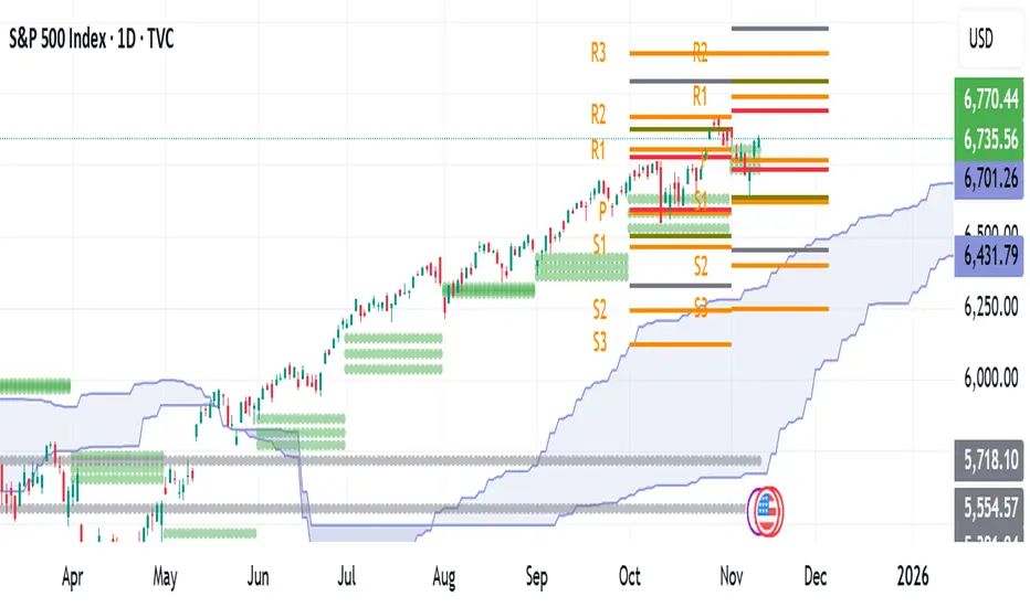 It merges the Ichimoku Cloud, Central Pivot Range (CPR), and Pivot Points into a single visual framework that shows:
