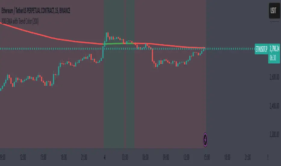 This script plots the 200-period Exponential Moving Average (EMA) and dynamically changes its color based on the trend direction. The script helps traders quickly identify whether the price is above or below the 200 EMA, which is widely used as a long-term trend indicator.