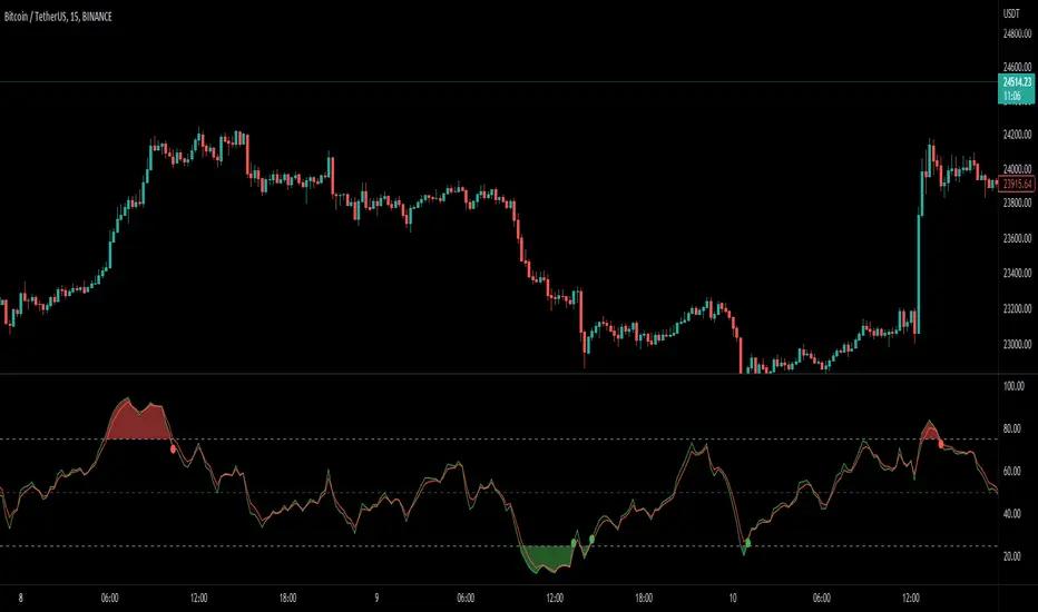 We have 2 different signal modes: when the different size RSIs cross and when the fast RSI crosses the extreme bands.