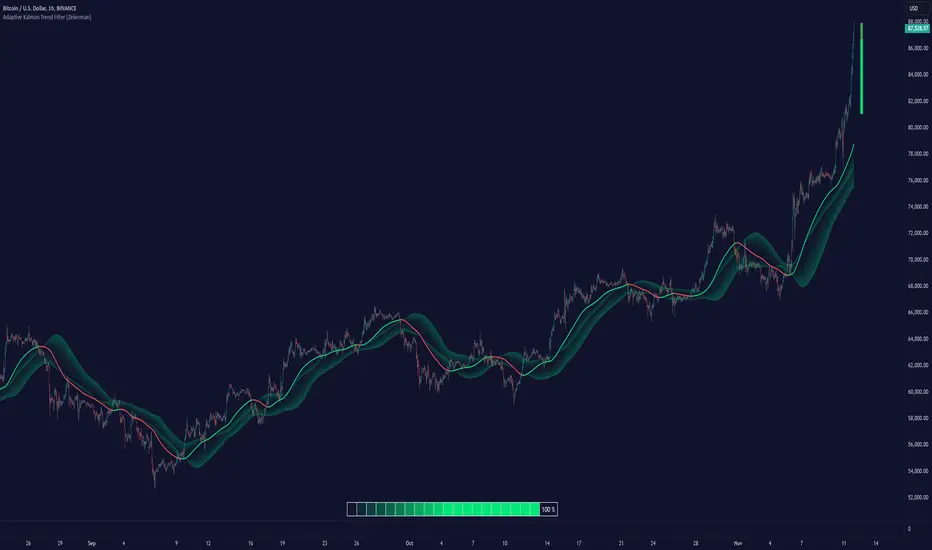 The Adaptive Kalman Trend Filter indicator is an advanced trend-following tool designed to help traders accurately identify market trends. Utilizing the Kalman Filter—a statistical algorithm rooted in control theory and signal processing—this indicator adapts to changing market conditions, smoothing price data to filter out noise. By focusing on state vector-based calculations, it dynamically adjusts trend and range measurements, making it an excellent tool for both trend-following and range-based trading strategies. The indicator's adaptive nature is enhanced by options for volatility adjustment and three unique Kalman filter models, each tailored for different market conditions.