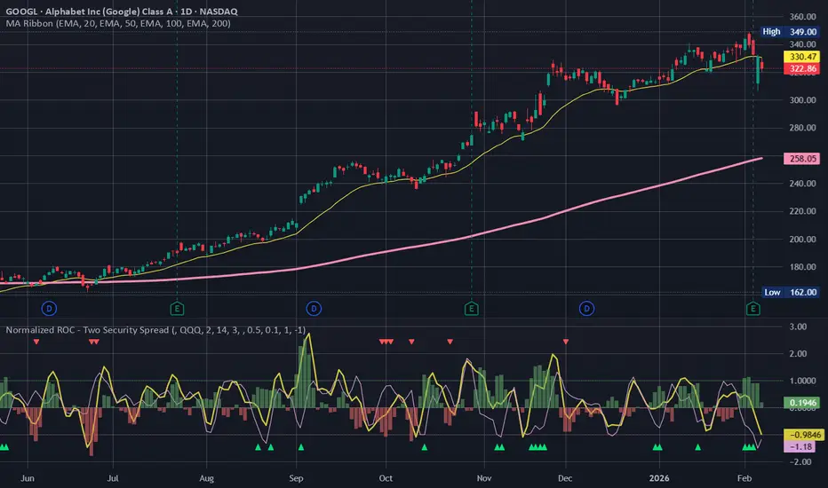 The plot draws both securities' NormROC as lines and the spread as a histogram. So, histogram shows green, when the stock is stronger than the benchmark even in their normalized terms, indicating strong momentum, and vice versa as red. Furthermore, the indicator marks with triangles so called hidden strength and hidden weakness. Hidden strength occurs when Benchmark (e.g. QQQ) is weak, but the stock is not. The assumption is that when the benchmark turns positive the stock is ready to run faster. Respectively, hidden weakness is when Benchmark is strong, but the stock does not follow. Of course, there will be many false signals, these are just potential indications of strength and weakness.