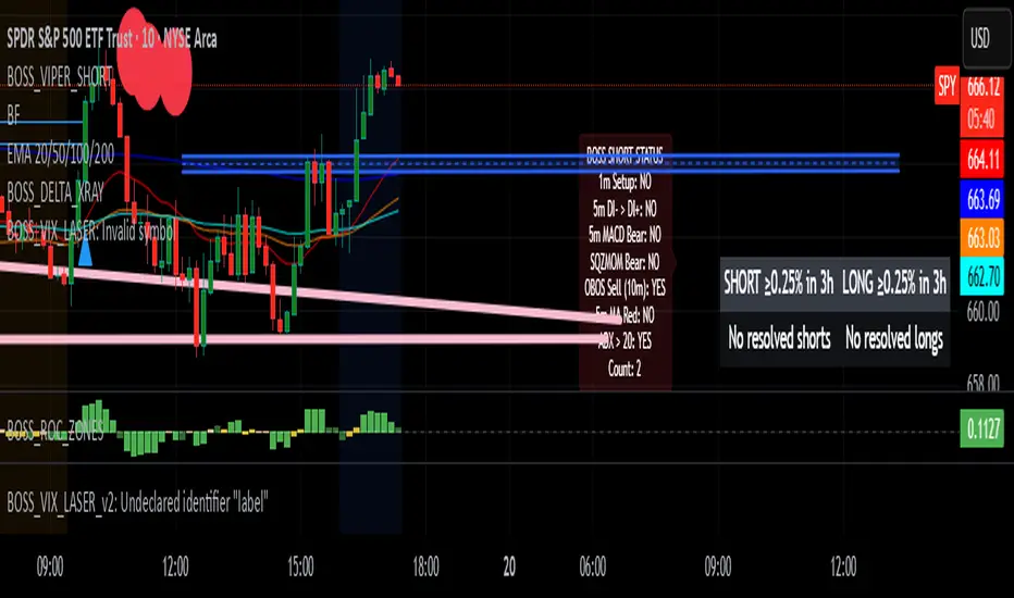 BOSS_VIX_LASER is a compact market-volatility dashboard designed to keep you aligned with short-term risk conditions. It combines the 1-minute VIX rate-of-change with TICK 200-EMA breadth pressure to deliver a simple but highly responsive view of intraday psychological shifts in the market.