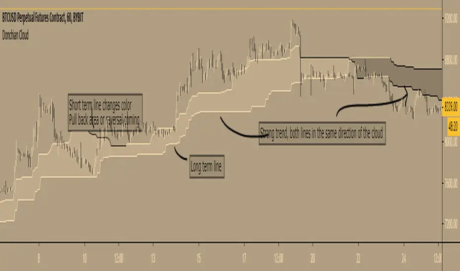 A cloud based on the highest high and lowest low of a given period (Donchian), same lines used in Ichimoku Cloud (Conversion line or Base line).