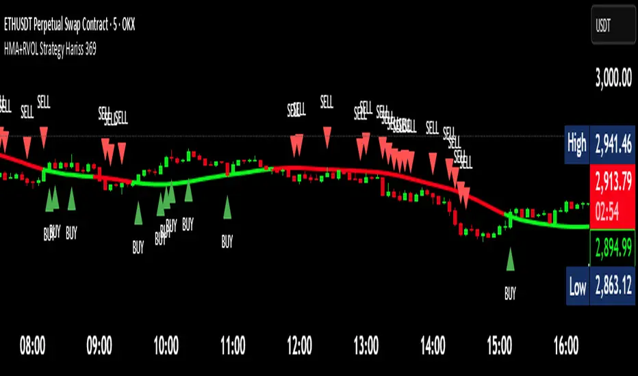 The Hull Moving Average (HMA) is a smooth, fast, and highly responsive moving average created by Alan Hull. It reduces lag significantly while still maintaining smoothness, making it one of the most popular tools for trend detection and entries. It is widely used for trend filter. Hull Moving Average(HMA) with RVOL strengthens the trend as volume is prime factor of price movement.