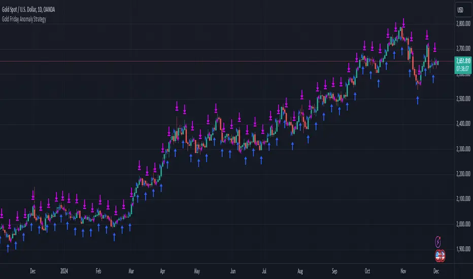 This script implements the "Gold Friday Anomaly Strategy," a well-known historical trading strategy that leverages the gold market's behavior from Thursday evening to Friday close. It is a backtesting-focused strategy designed to assess the historical performance of this pattern. Traders use this anomaly as it captures a recurring market tendency observed over the years.