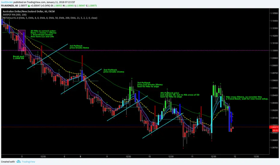 This study is an alternative Pullback Tool to my previous versions "Pullback Trading Tool R#.# by JustUncleL". This version aims to provide a cleaner but powerful trading tool. It incorporates the majority of the indicators needed to analyse trade Trends for Pullbacks and Reversals. You can optionally use Heikin Ashi candle or Renko charts. The notes here are mainly in reference to using standard Candlestick 60min signal chart (or Anchor chart time frame), other higher time frames can be used instead as Anchor Time Frames such as 240min(4hr) or 1440min(Daily).