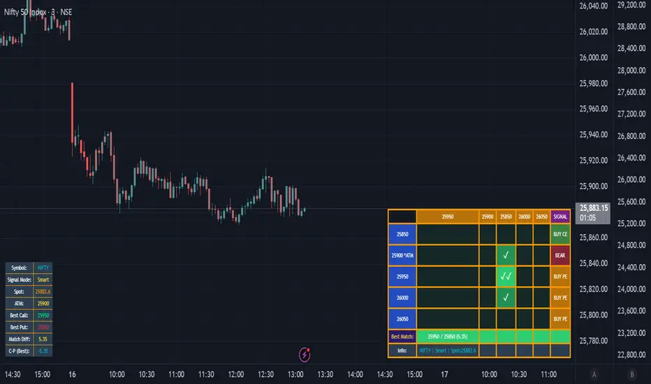 The Call-Put Cross Strike Match [Pro] is an institutional-grade options analysis tool designed exclusively for NSE NIFTY and BANKNIFTY traders. Built on Pine Script v6, this indicator combines sophisticated cross-strike matching algorithms with intelligent trading signal generation to identify optimal options trading opportunities in real-time.