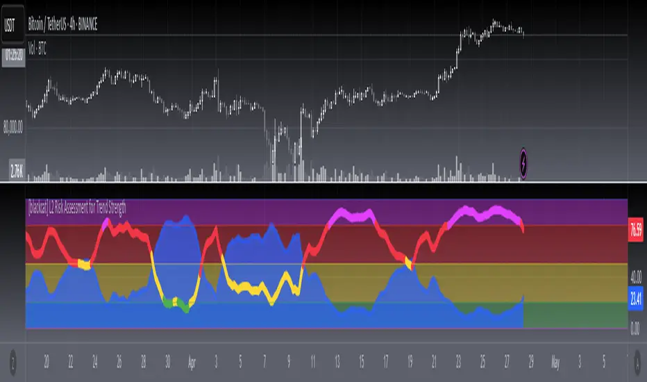 Corrected color scheme as community suggested:OVERVIEW This TradingView indicator ([blackcat] L2 Risk Assessment for Trend Strength) provides multi-layered analysis tools to evaluate real-time market risk exposure and assess trend momentum strength. It combines price action ratios, smoothed oscillators, and visual risk zone mapping into a single analytical framework.