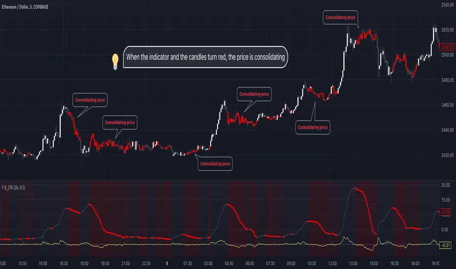 The "F.B_Consolidation Range Identifier" (F.B_CRI) is an indicator aimed at identifying consolidation areas in the price chart. Here is an explanation of the logic and usage of this indicator: