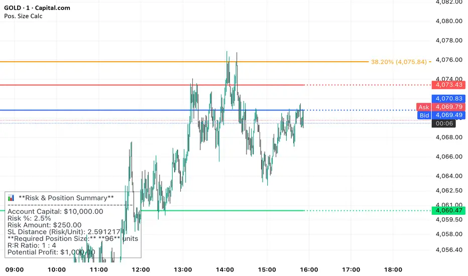 Heads-Up Display (HUD): A clean, fixed table in the bottom-left corner of the chart clearly displays all calculated metrics, including your Required Position Size (in units/shares/contracts), Risk Amount, and Potential Profit.
