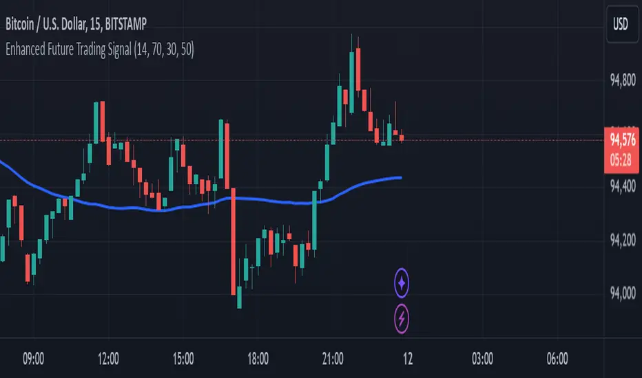 This script is a trading indicator designed for future trading signals on the TradingView platform. It uses a combination of the Relative Strength Index (RSI) and a Simple Moving Average (SMA) to generate buy and sell signals. Here's a breakdown of its components and logic: