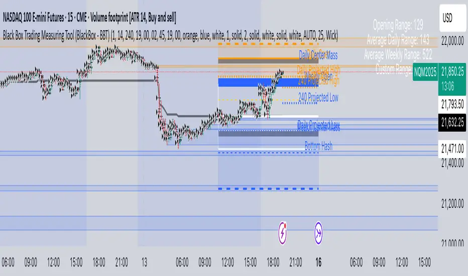 The Black Box Trading Indicator is a comprehensive technical analysis tool that combines multiple trading concepts into a single, powerful indicator. It displays custom session ranges, Average Daily Range (ADR) projections, support/resistance levels, and order blocks to help traders identify key market levels and potential trading opportunities.