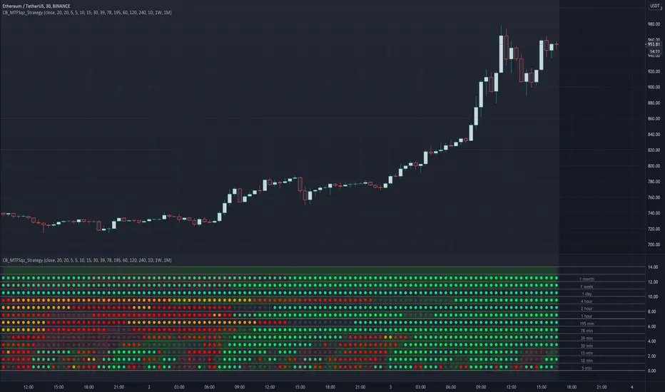 For example the 30 min row shows the first green dot after the sequence of squeeze dots and the direction of the price movement (up or down) at that green dot bar aligns with the direction of the price movement in the higher timeframe chart.
