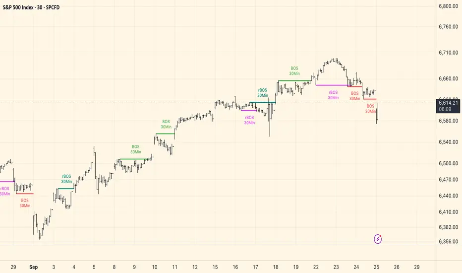 This is the same Multi-Timeframe Break of Structure and Market Structure Shift posted by Lenny_Kiruthu. However, the only difference is the naming of Market Structure Shift to rBOS (Break of Structure Reverse). To me, they are all break of structures when previous peaks or valleys are violated. The only difference is in sequence. Once a sequence of BOS reverses, then a new sequence begins. To me, this simplifies the various terminology incorporated by different systems such as ICT or SMT which adds unnecessary complexity.