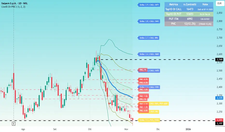 OI-PNC Levels is a script that displays the open interest (OI) and net short positions (PNC) of a selection of 20 of the most significant stocks in terms of traded value on the Italian market.