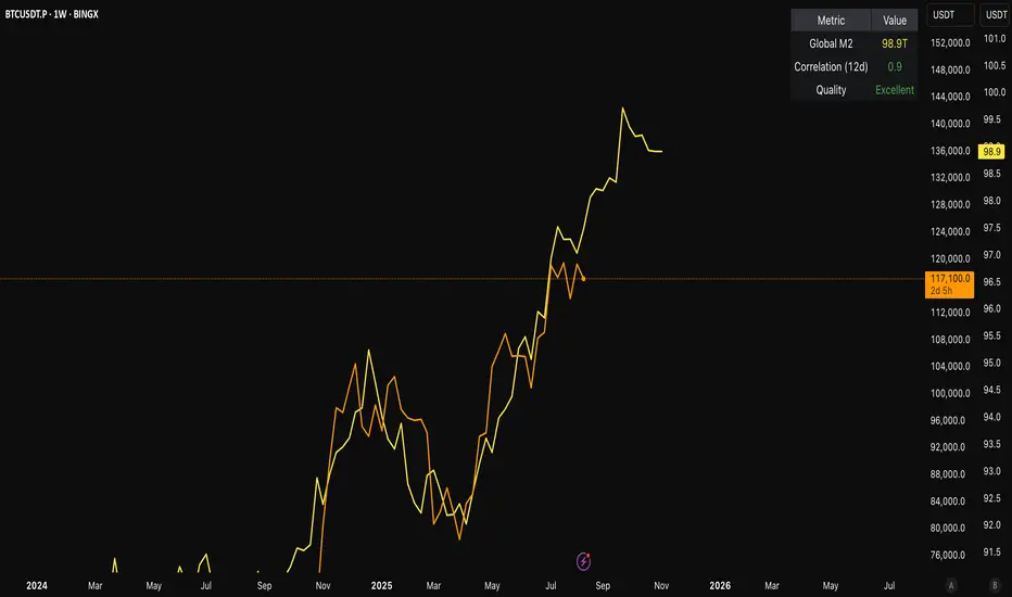 This custom indicator visualizes and analyzes the relationship between the global M2 money supply and Bitcoin (BTC) price movements. It calculates the correlation between these two variables to provide insights into how changes in global liquidity may impact Bitcoin’s price over time.