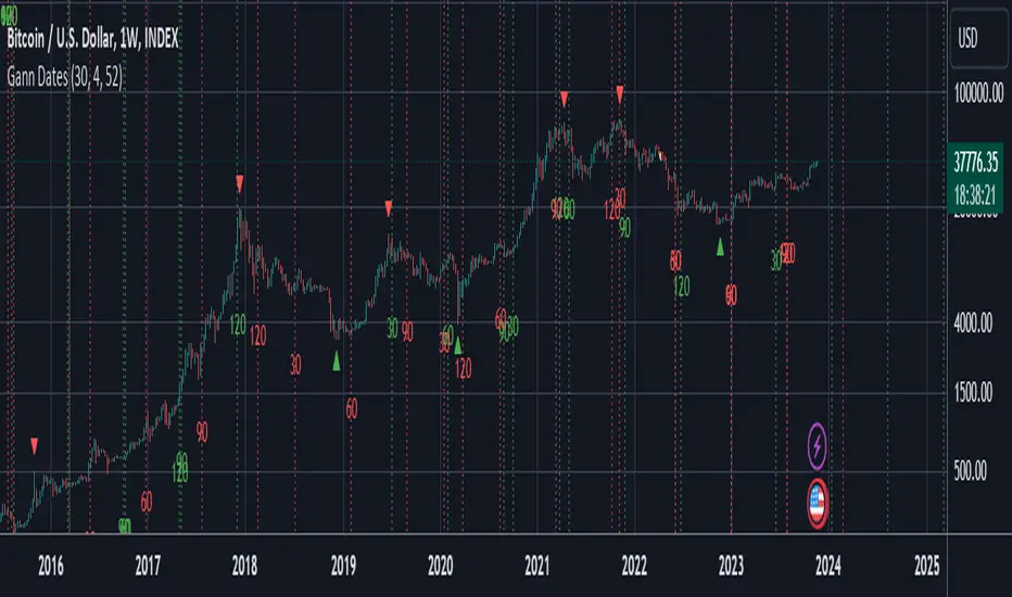 - Gann angles: The script will plot dates that are distant from pivots by a multiple of this.
