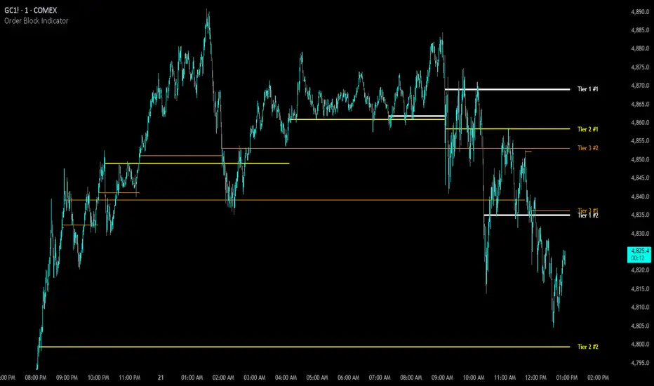 The Order Block Indicator is a multi-timeframe institutional order detection tool designed to identify significant price levels where large order activity has occurred. Using a proprietary adaptive algorithm, the indicator analyzes order size and frequency from multiple timeframes to determine areas where price is likely to have a significant reaction when it returns to those levels.