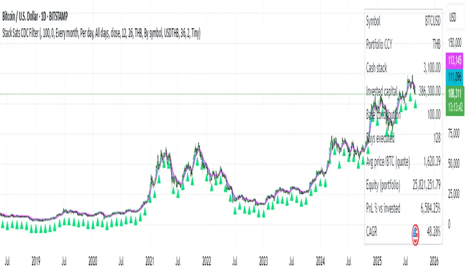 This indicator simulates fixed-amount Bitcoin DCA (dollar-cost averaging) and lets you apply a CDC Action Zone filter to only buy in specific market conditions. It plots EMA(12/26) lines with a shaded zone (green when fast > slow, red when slow > fast), shows buy markers on the chart when a DCA event actually executes, and displays a concise performance table.