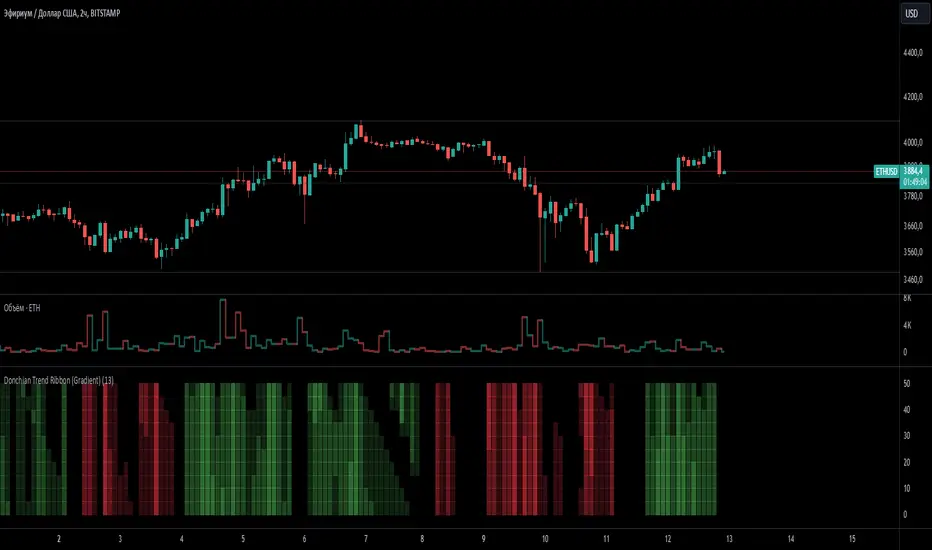The Donchian Trend Ribbon (Gradient) uses Donchian Channels to visualize trend direction, strength, and market phases. Columns with varying colors and intensity help traders quickly assess trends.