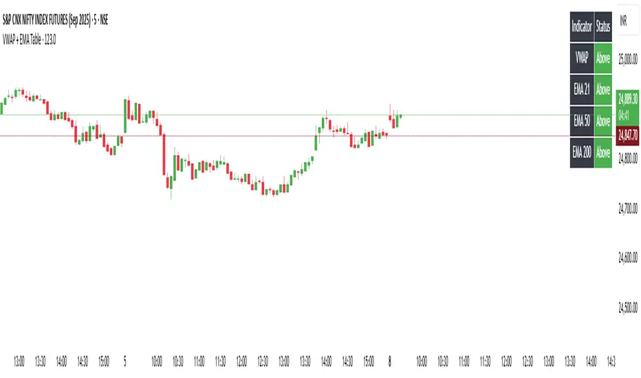 Table Shows VWAP EMA 21 EMA 50 and EMA 200 with clear UP Down