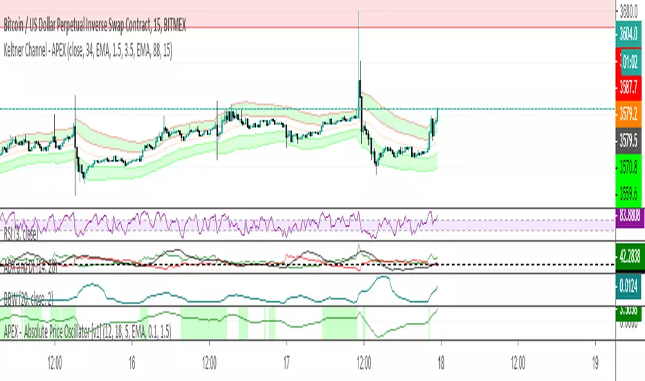 The Absolute Price Oscillator is calculated as a difference of two moving averages of an asset and is expressed as an absolute value. It rates the strength of the trend. This Oscillator can be used primarily as a filter for stronger trends or for coin specific strategies.