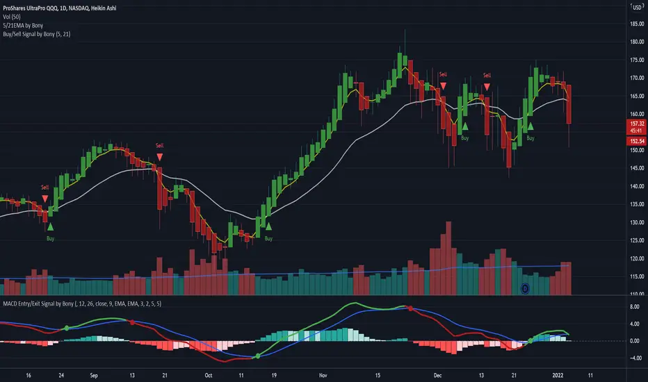 This script attempts to use Exponential Moving averages (short-term and long-term convergence) of different lengths in order to identify trade entries and exits for bullish & bearish trades. I would strongly recommend using this as a guide to enter or exit long-term swing trades on growth names such as Apple, Tesla, Microsoft to keep your emotions out of the trading. You use this script by entering a trade when it signals a green BUY signal with a UP arrow and exiting when it signals red. The general idea is that one is fast and one is slow-moving EMA and these indicate when to buy/sell when they crossover the overbought/sold lines.