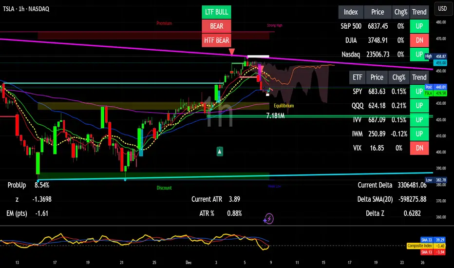 The Composite Predictive Index (CPI-IG v5) is a comprehensive Market Institutional Indicator created by Alcides Davila and is an overlay indicator designed for institutional-grade market analysis and trading signals. Nevertheless, Daily-Short-Term Traders may also take advantage of this robust and efficient indicator. Still, they must make the necessary adjustments for scalping and for short-, medium-, and long-term trading. It synthesizes multiple technical factors (e.g., RSI, MACD, Bollinger Bands, VWAP, EMAs/SMAs, volume pressure, delta volume, manual sentiment/news inputs) into a weighted Z-score-based probability model (probUp) for forecasting price direction—generating buy/sell gates, strong/ultra signals, and short-term projections. It supports multi-timeframe alignment (HTF/LTF), breakout/breakdown detection with retests, internal backtesting, and alerts, while displaying dashboards for probabilities, stats, oscillators (bull/bear/neutral), major indexes (S&P, DJIA, Nasdaq), and ETFs (SPY, QQQ, etc.).