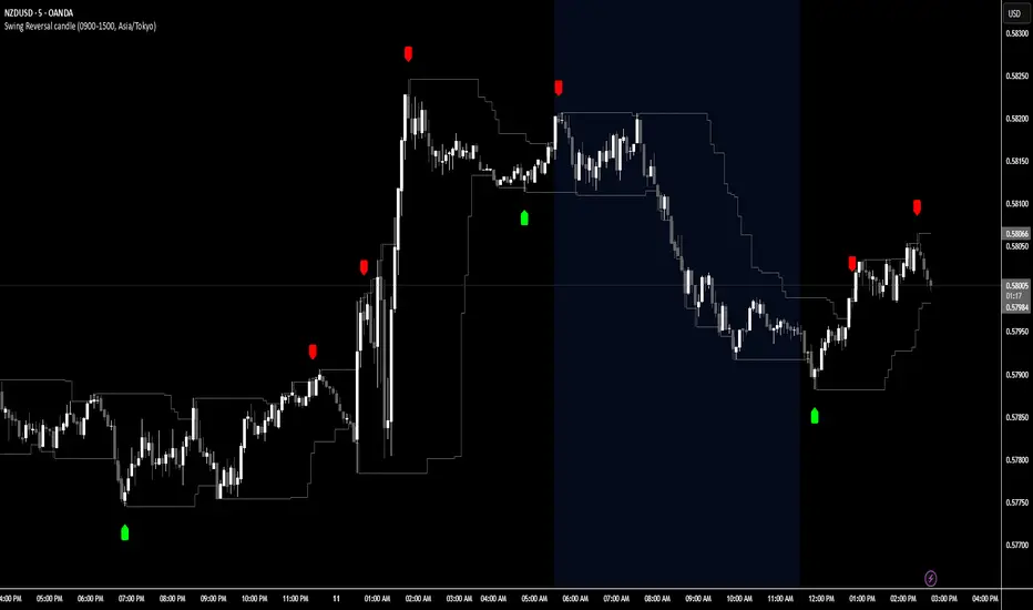 The tool first determines the most recent swing high and swing low by scanning the previous 20 bars. When the price touches or sweeps these levels, the indicator evaluates the current candle for strong reversal characteristics. These include wick dominance, body direction change, and structural validation against the previous bar. Only candles that meet all reversal criteria are marked.
