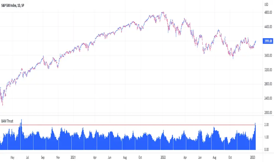 This indicator calculates the ratio and plots it as a histogram. The 1.97 threshold is also plotted as a horizontal line. Anytime the histogram gets above the line Breakaway Momentum has occurred.