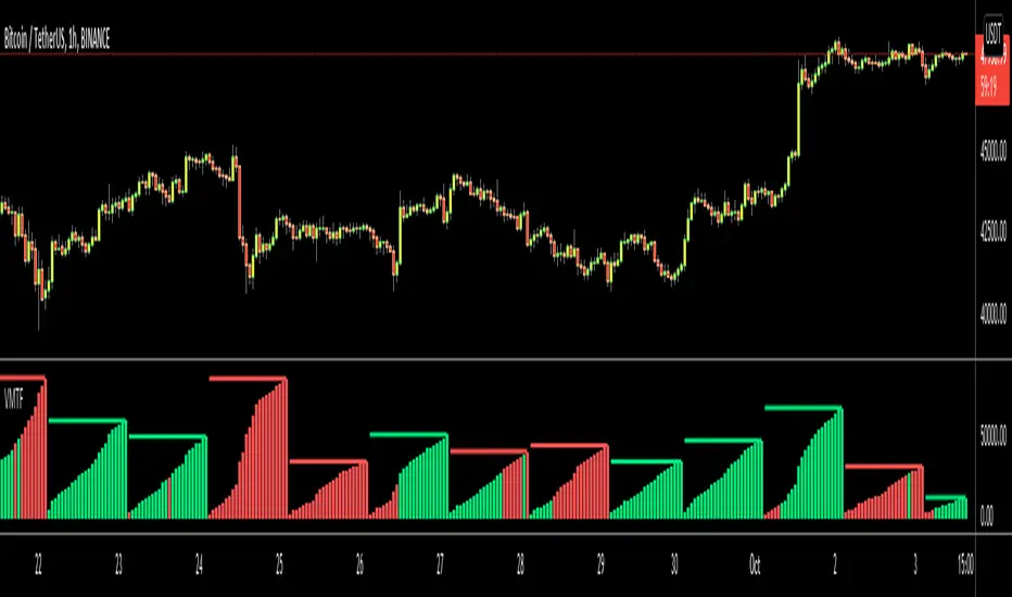 This script shows total volume info of Higher Time Frame. it checks open/close prices of higher time frame and sets the color. it also show a dynamic line on last volume , so you can see when HTF candle started and ended. by looking at the color of volume columns you can see HTF candle is green or red. it's something like weis wave volume that is using HTF candles.