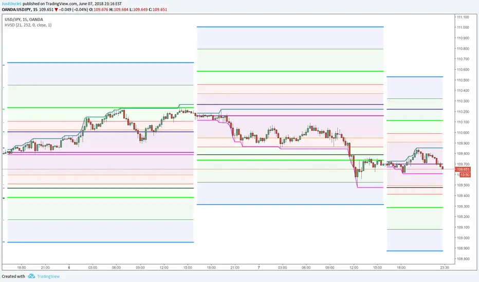 This indicator plots Daily Standard deviation levels on price chart based on Historical Volatility (HV). It uses the most common approach for calculating historical volatility as standard deviation of logarithmic returns, based on daily closing/settlement prices.