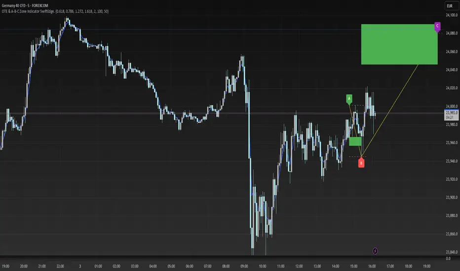 The OTE & A-B-C Zone Indicator SwiftEdge is a versatile tool designed to help traders identify high-probability trading setups using a combination of Optimal Trade Entry (OTE) zones, Fibonacci levels, and A-B-C price patterns. This indicator is particularly useful for traders who rely on price action and Fibonacci-based strategies to find entry points, set stop-losses, and target potential take-profit levels. By integrating swing point detection, trend analysis, and Fibonacci projections, SwiftEdge provides a clear visual framework for making informed trading decisions across various timeframes.
