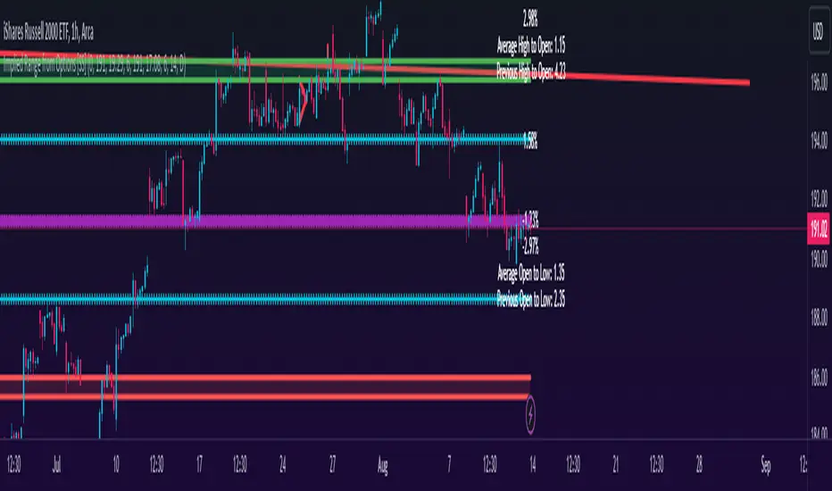 In addition, the indicator will display the average move from open to high and open to low over a user defined period (default to 14 candle period) as well as the previous open to high and open to low move from the previous day.