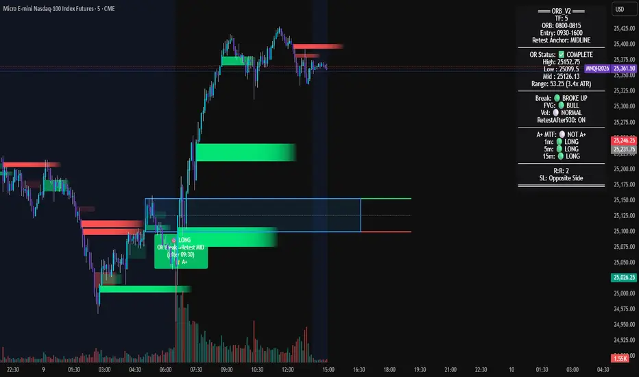 This script defines a customizable Opening Range (default 8:00–8:15 AM ET), tracks price behavior after the range is formed, and generates signals only when the market delivers a high-quality break-and-retest in your favor.