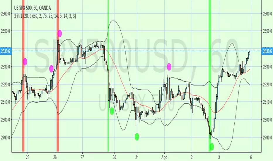 On the chart there are the BB with purple and green circles to give the entry signal once the price has come back in the bands.The background alert appair when BOTH RSI and STOCH are in overbuy or oversell. the defalt is 20/80 but can set it by yourself.