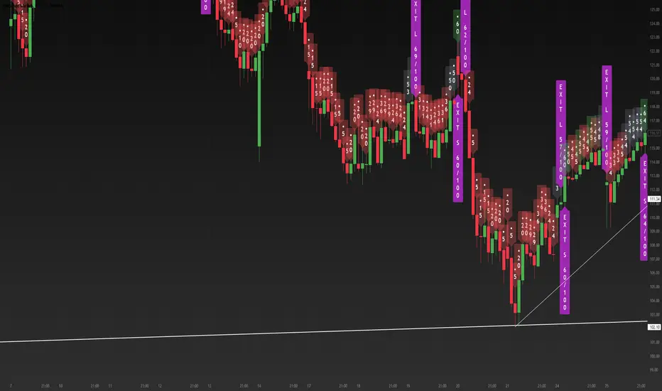 Moment Score Labels is a Pine v5 overlay indicator that shows momentum “ratings” (0–100) directly on the chart. It prints a vertical score label on every candle (rolling window to avoid label limits) and adds vertical SETUP/ENTRY/EXIT markers for both long and short signals. Signals are based on a weighted mix of trend (MA alignment + slope), momentum (RSI + MACD histogram), breakout (Donchian high/low), and volatility contraction, with an optional Daily regime filter and optional volume/breakout confirmations.