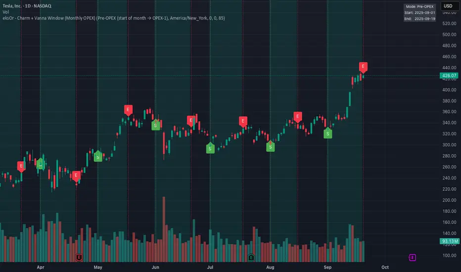 This indicator highlights the monthly “Charm + Vanna window” around standard monthly options expiration (the 3rd Friday, i.e., monthly OPEX). It’s a time-based overlay that shades either: