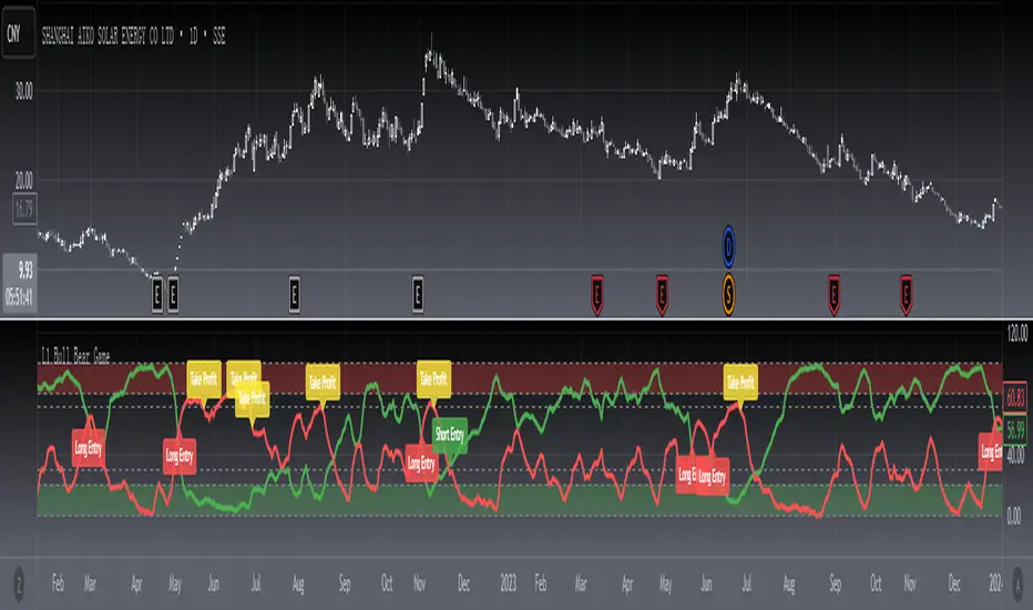 Configure input parameters according to your trading preferences: • Set Overbought Level (default: 80) • Define Oversold Level (default: 20) • Adjust Take-Profit Target (default: 71) • Modify Bull/Bear Threshold (default: 30)