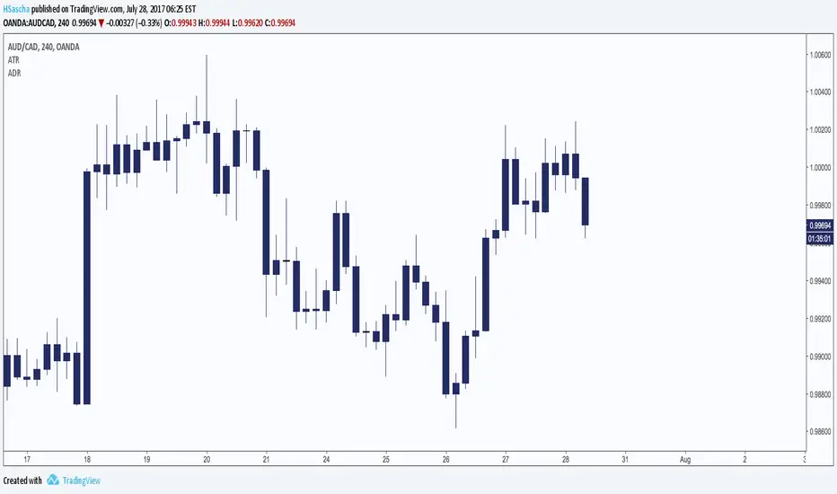 Basic ADR-indicator that is showing the daily range on lower timeframes as well, without using the current open daily bar for calculation.