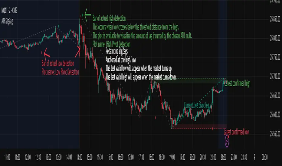 Pivots are confirmed only after price moves sufficiently in the opposite direction. This creates necessary lag. The ZigZag is drawn when this occurs, and will anchor to the high/low in the past. Optional detection dot plots show exactly when confirmation occurred.