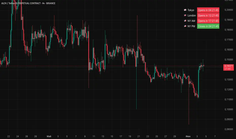 It shows which sessions are currently open, how much time remains until they open or close, and optionally sends alerts in advance.