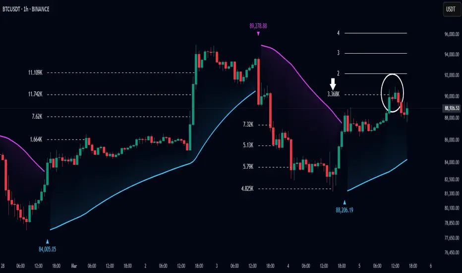 > Dynamic Level Updates: - When the price crosses a deviation level, the level becomes dashed and its label changes to display the volume at the breakout point.