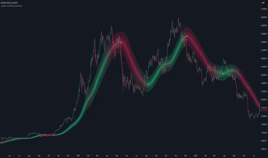 The Gradient Trend Filter is a dynamic trend analysis tool that combines a noise-filtered trend detection system with a color-gradient cloud. It provides traders with a visual representation of trend strength, momentum shifts, and potential reversals.