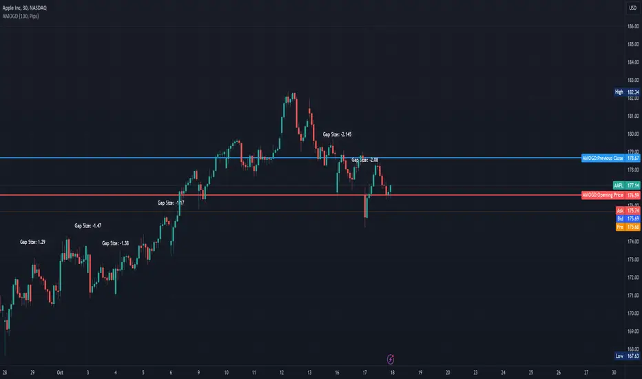 The Advanced Market Opening Gap Detector (AMOGD) is a Pine Script indicator designed to help you identify market gaps at the opening of a new trading day. Gaps are areas on a chart where the price of a security moves sharply up or down with little or no trading in between. They are significant as they may indicate a change in market sentiment. This indicator highlights the size and direction of the opening gap, allowing you to potentially adjust your strategies accordingly.