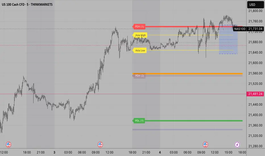 PDH/PDL (Day 1 & Day 2): Draws horizontal lines marking the previous two trading days’ highs and lows.