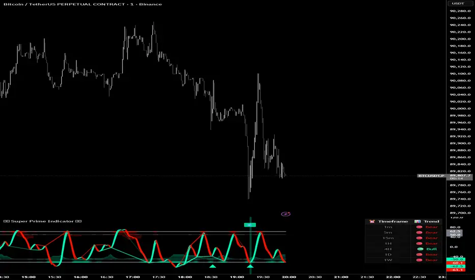Super Prime Indicator is an advanced, all-in-one market intelligence tool that combines machine-learning-enhanced SMI, Whale Hunter Pro logic, multi-timeframe trend analysis, and probabilistic market modeling into a single, highly visual oscillator.