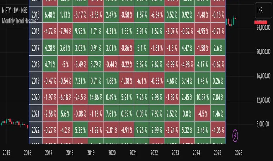 This indicator analyzes multi-year monthly price seasonality and displays it as a clear table of percentage returns for each month, from 2013 to the current year. By calculating the monthly open-to-close percentage change, it helps traders quickly identify recurring seasonal trends, positive or negative months, and long-term behavioral patterns of the selected market.